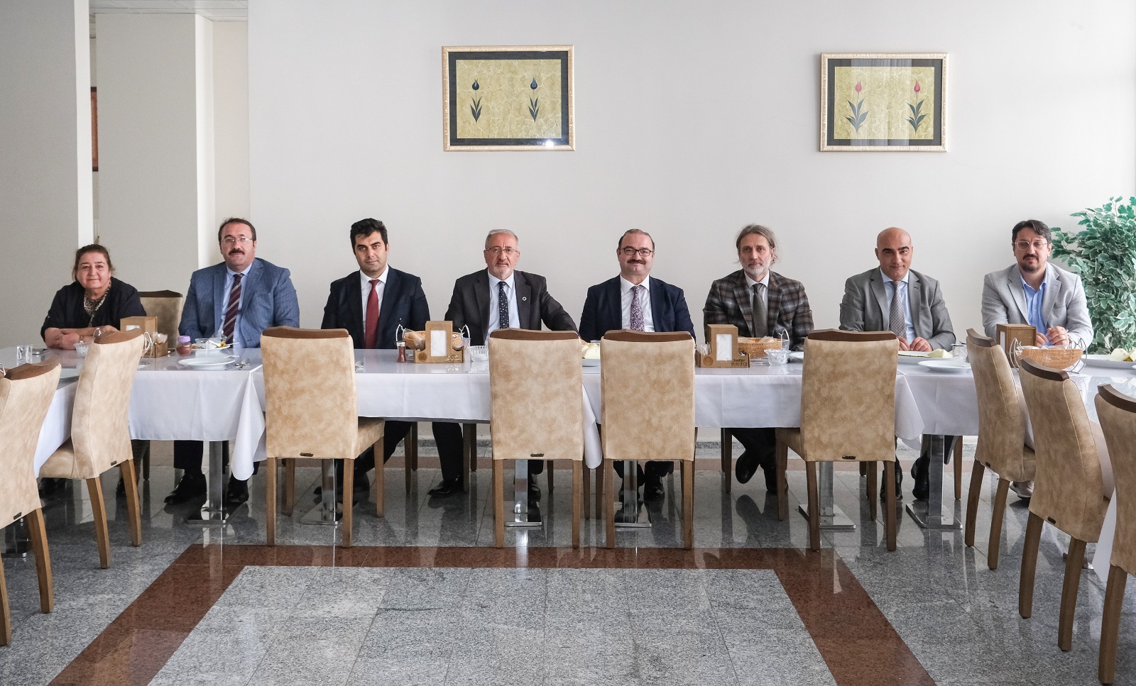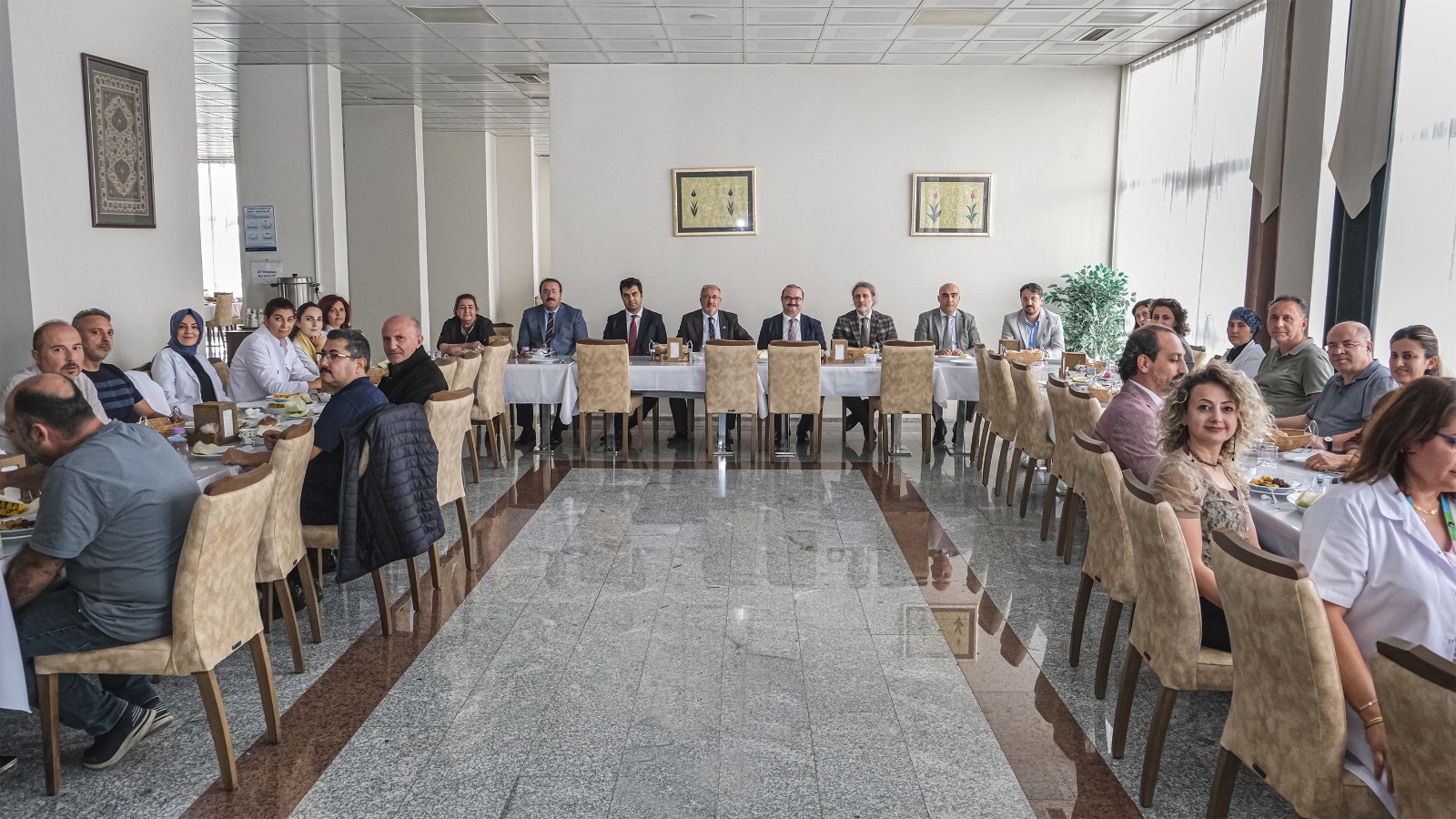 Rektör Hacımüftüoğlu, hastane hekimleriyle bir araya geldiği öğle yemeği programında, sağlık hizmetleri üzerine karşılıklı fikir alışverişinde bulundu. Akabinde Başhekim Prof. Dr. Bilgehan Erkut ile hastanenin genel durumu ve sağlık hizmetlerinin geliştirilmesi yönünde bir görüşme gerçekleştirdi.